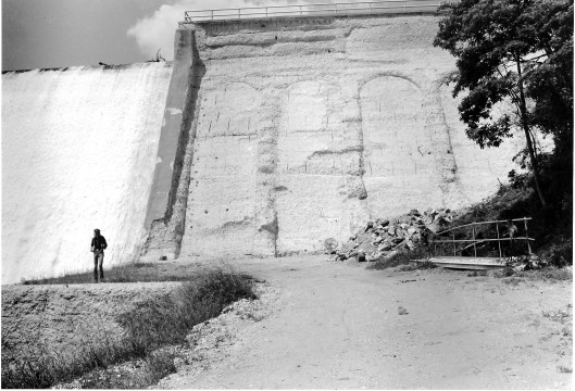 Here is the same dam in the 1970s – it was falling apart really bad. Looking close you can see a circular cap on the lower face.