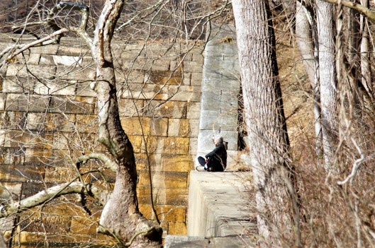 Kathy has known that I always wanted to go to the other side of the dams (in all my years hiking, I’ve never been there), so she grabs up Molly and starts heading across the rocks.