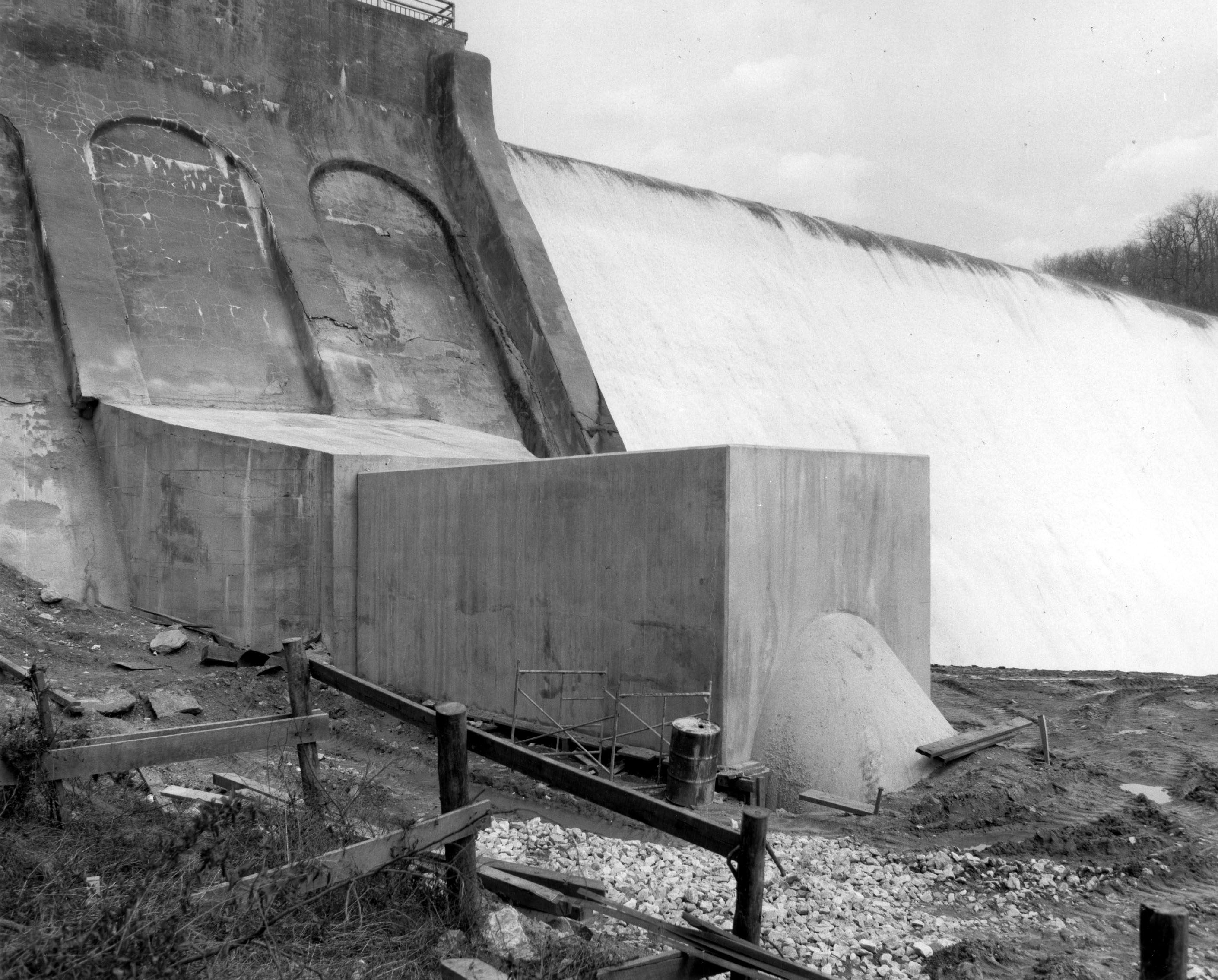 Here is the same dam in the 1970s – it was falling apart really bad. Looking close you can see a circular cap on the lower face.
