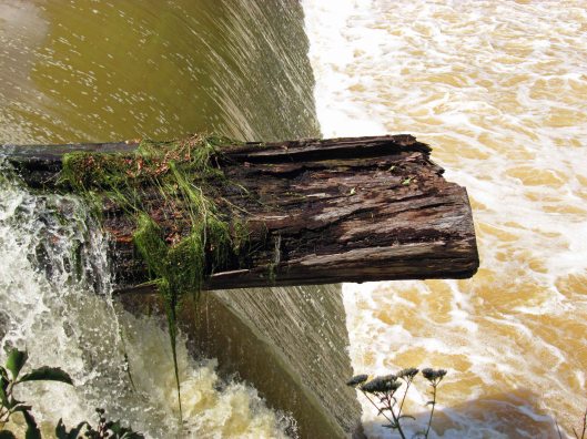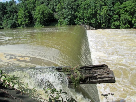 I am amazed that this log is still here after all these years. I just want to jump up and down on it to get it the hell off the top of the dam! Damn log! Log jam at the dam.