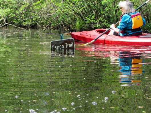 So we make our left hand turn and Kathy see’s this sign. It is halfway covered up. She goes in for a closer look and under ‘Canoe Trail’ is an arrow pointing right.
