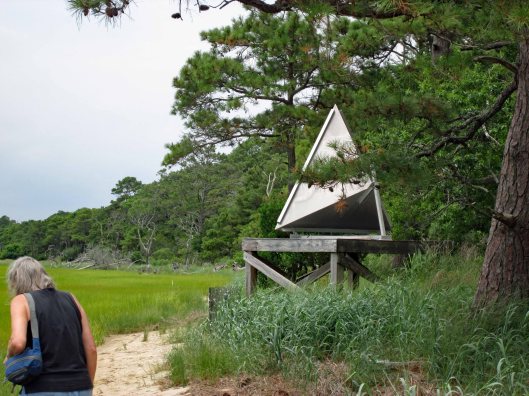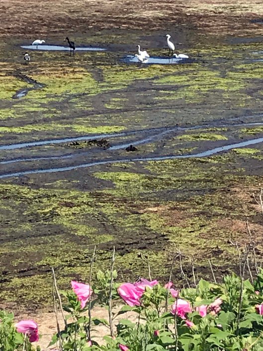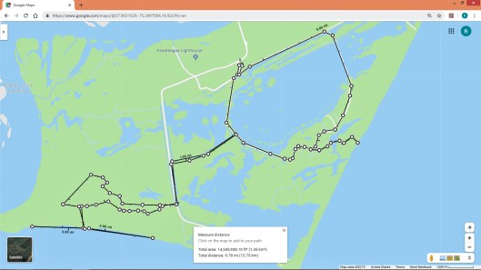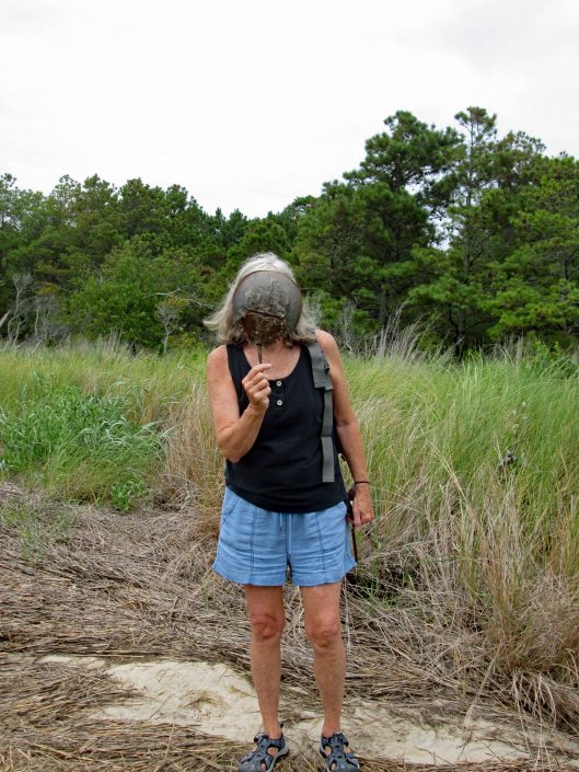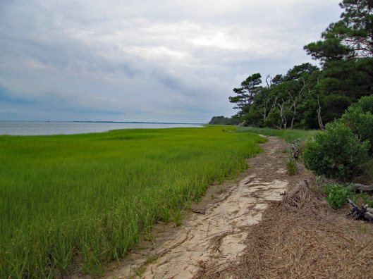 The beach is under a constant state of erosion and the Rangers/contractors are under a constant state of trying to fix it. I’m going to go out on a limb here and guess that the Atlantic Ocean and Tom’s Cove will soon be connected. That at the rate of erosion, maybe by 2025 this stretch of the beach will be gone. So much for doomsday projections…Kathy and I headed over to the cove. Kathy was wondering how are we going to get over to that strip of land. The tide was the lowest we have ever seen it. Off in the distance is where we usually hike – The Bi-valve Trail.