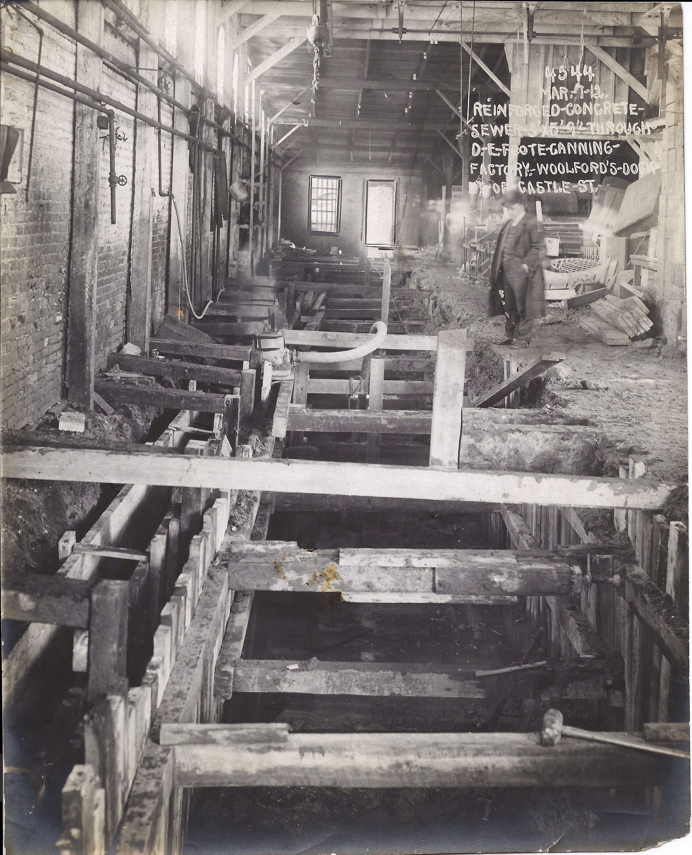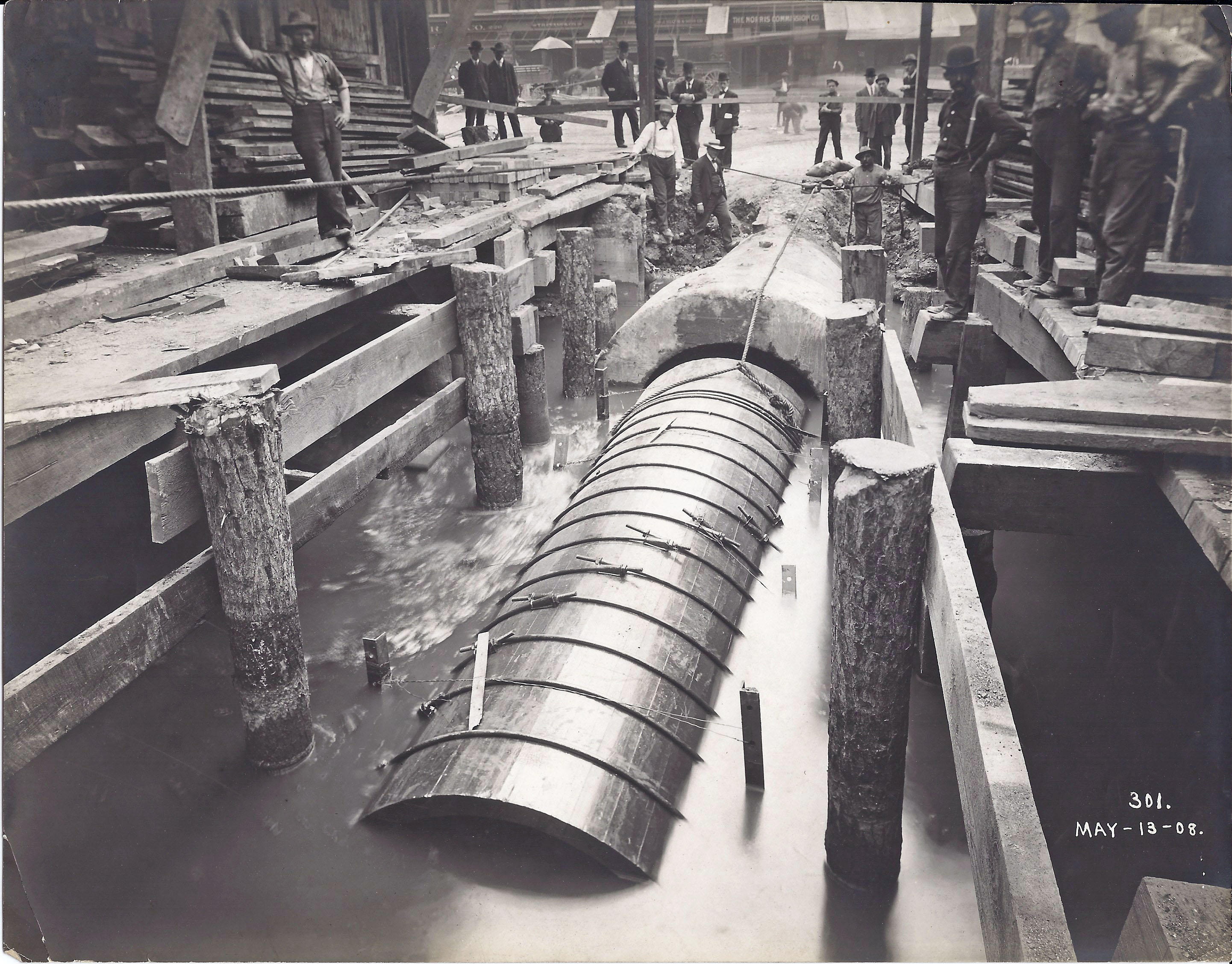 Another photo of a lead jointed pipe. I believe this is the water main under Curtis Creek. Looking close you can see the workmen pouring the lead into the joint.
