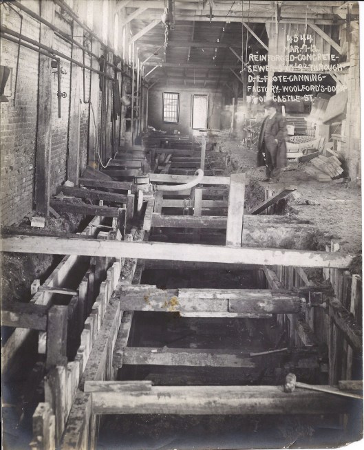 The water engineers boiled up their own alum in lead lined vats and it was then pumped across the street through the lead pipes. Below is one of the vats right after the lead was replaced. Over the years there were many contracts to recoat the insides of the vats. When the vats were no longer used, city workers climbed down into them to remove the lead sheeting.