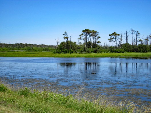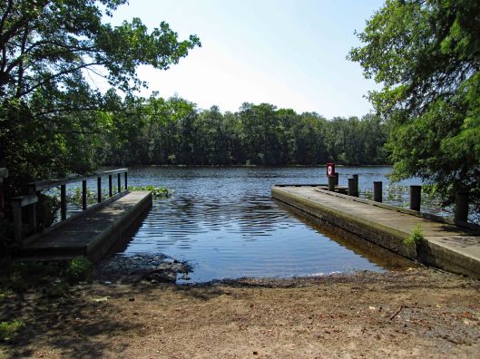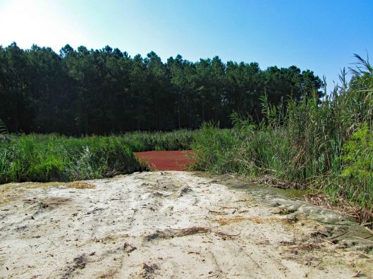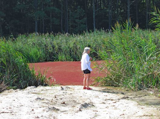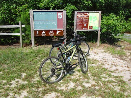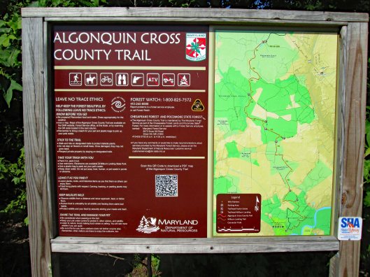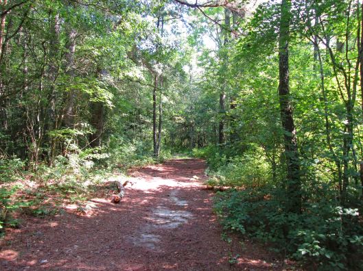This was a 3.6 mile or a 4.1 mile hike, depending on which map you use, in the Pocomoke State Forest. There is also a Green Trail (4.4 mi) and a Blue Trail (5.2 mi) in the same area. We chose the White Trail because it heads towards a creek – Corkers Creek. The entrance is across Rte. 113, from Shad Landing. Nice empty parking lot.