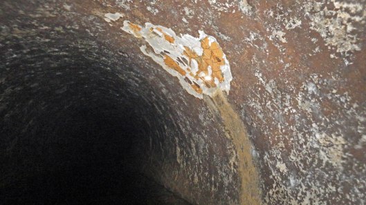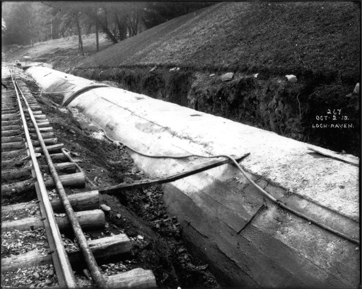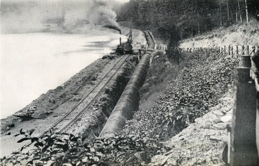 Better, but not as good as the original below. This one is an electronic copy from a glass plate negative I scanned back in 2007. In 1913 (I know, it looks like 1915 but it is not) the contractors performed a pressure test on the 10′ conduit from the new dam at Loch Raven to the old dam.