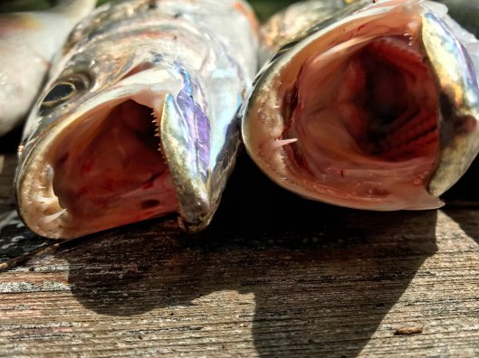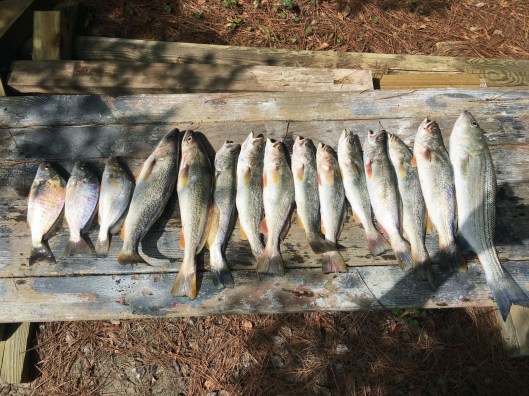Our catch for the day: 1 rock fish, a few Trout and 3 Spots. We caught a bunch of Spots and most of those were used for bait. Also caught a couple Oyster Toad fish and Croakers, which do make a croaking noise.