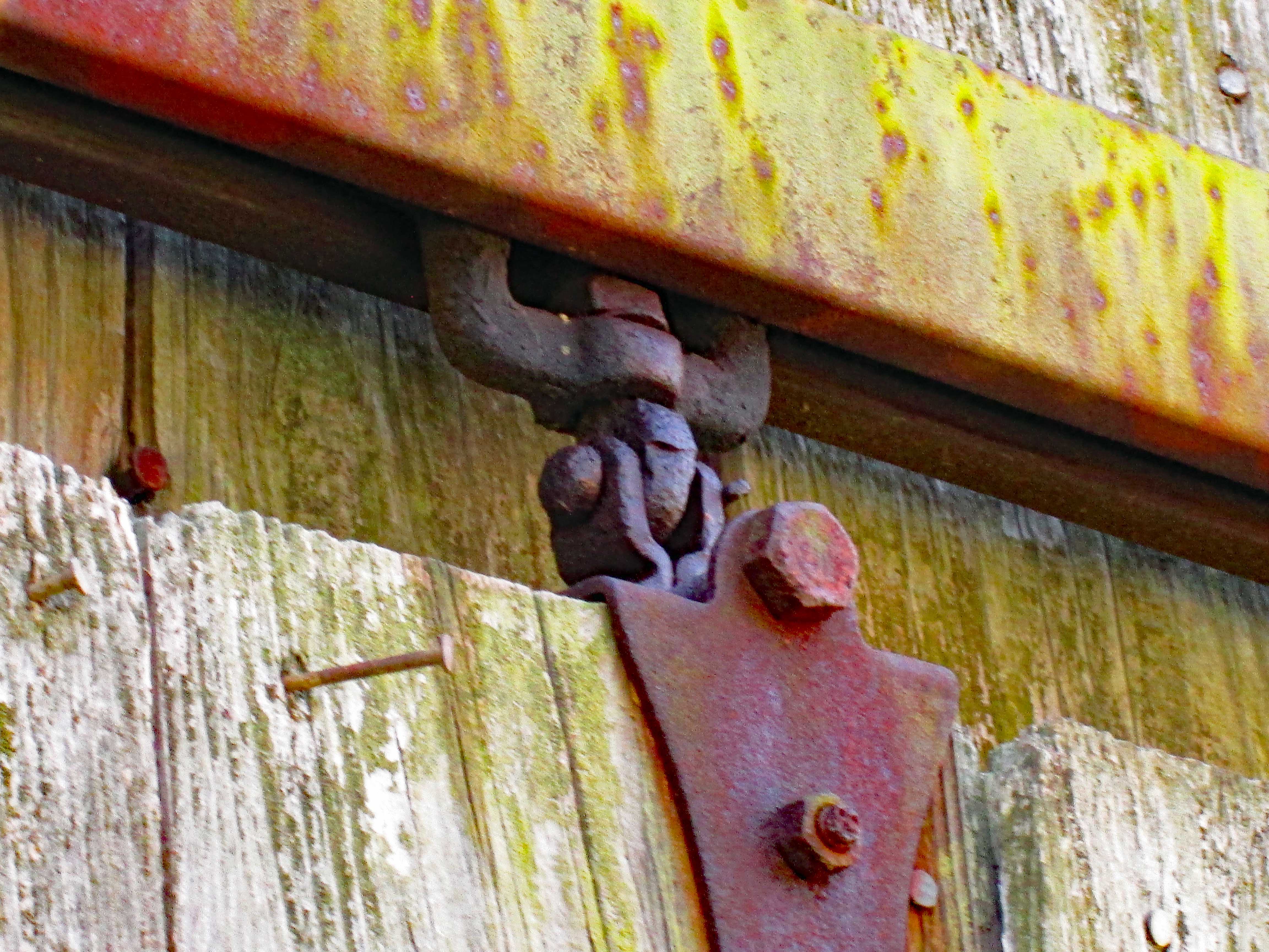 Merrill said it was alright to clean it up so Kathy and I did just that. We carefully removed the rotten wood around the nails which were firmly seated into the concrete. I was surprised that they had not rusted away. After that we used a brush and water to clean off the algae, lichen, mold and mildew.