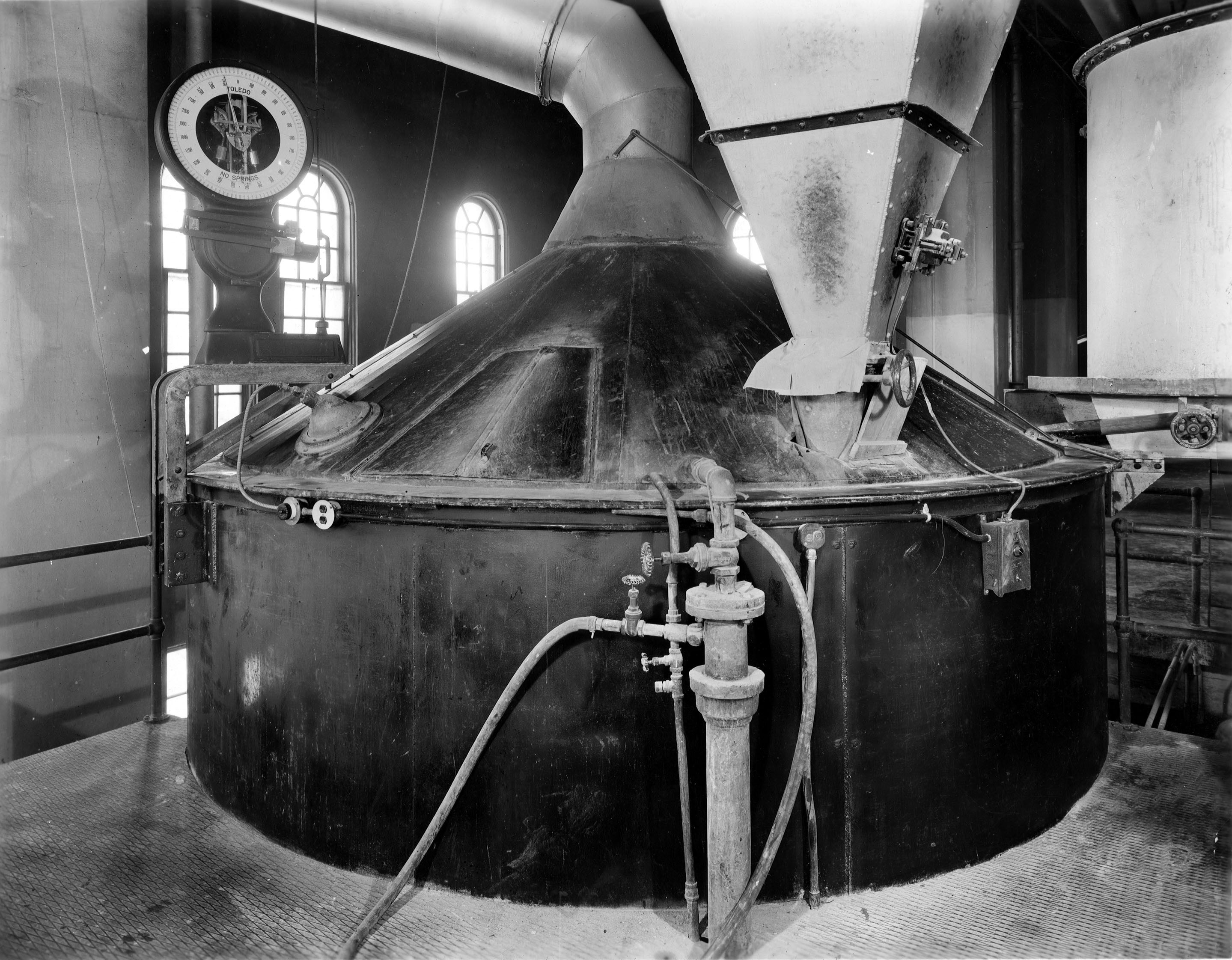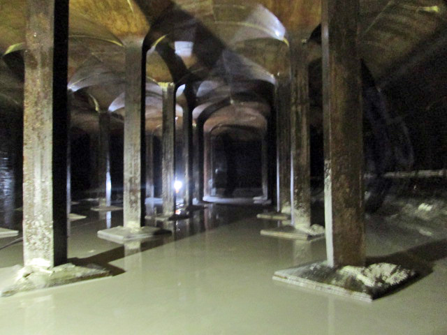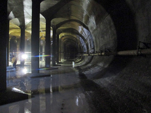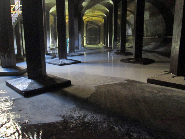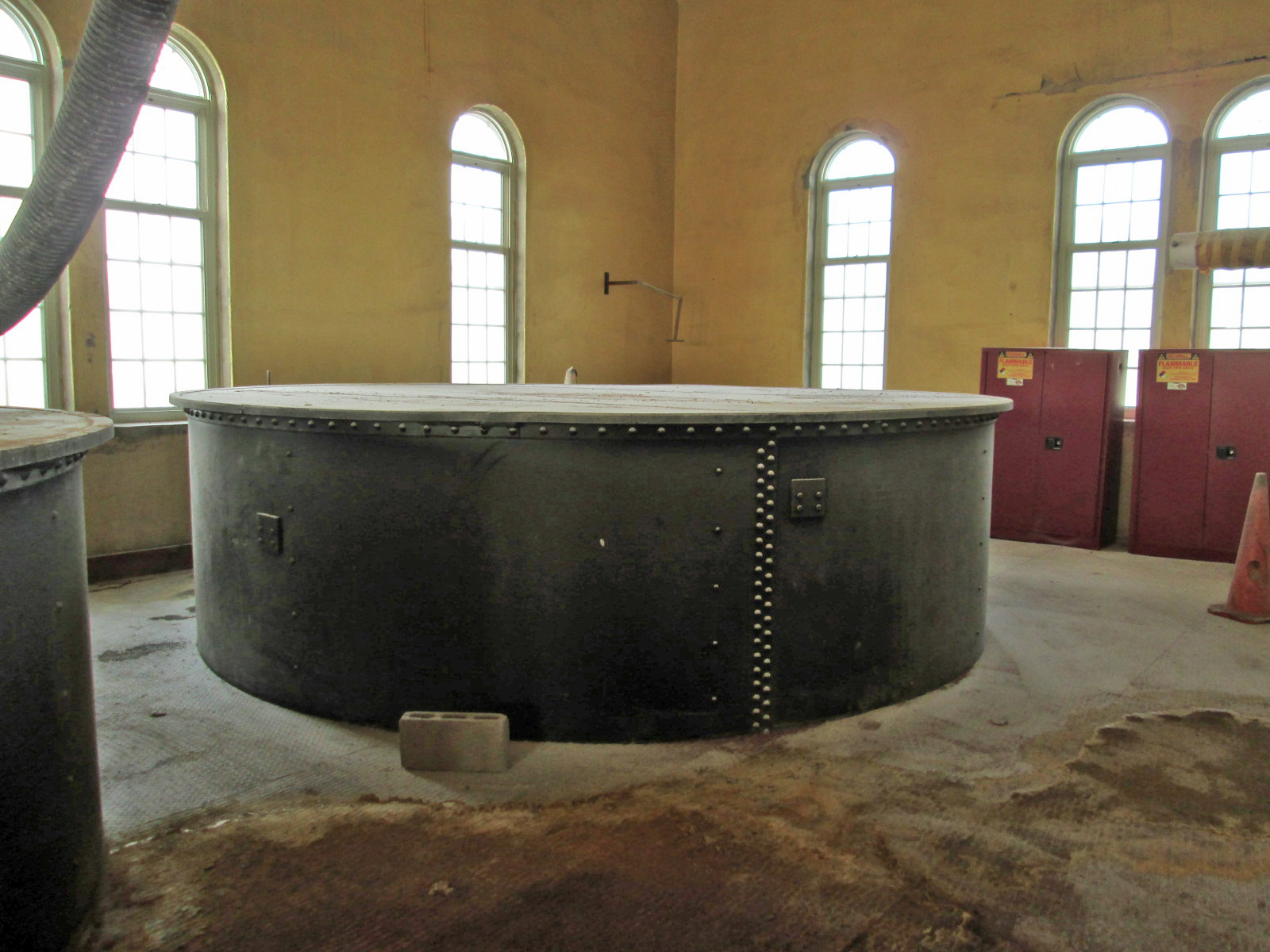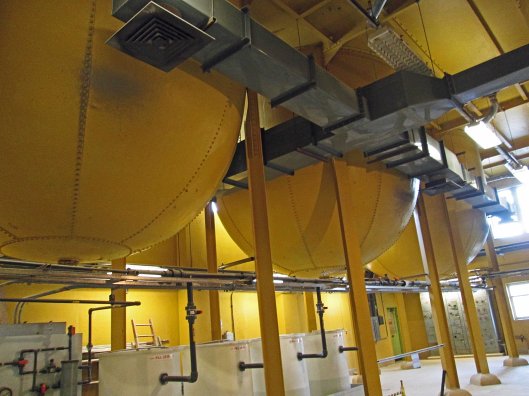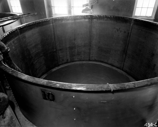 The water engineers boiled up their own alum in lead lined vats and it was then pumped across the street through the lead pipes. Below is one of the vats right after the lead was replaced. Over the years there were many contracts to recoat the insides of the vats. When the vats were no longer used, city workers climbed down into them to remove the lead sheeting.