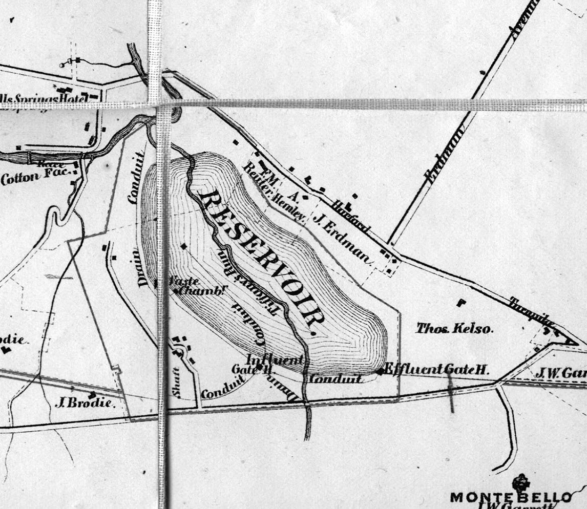 This is one of the original drawings from 1875 showing the lake being built over Tiffany Run, which dumps into Herring Run. The run was diverted into a tunnel from the gate house, lower left of lake then heads along, marked as drain conduit to Herring Run.