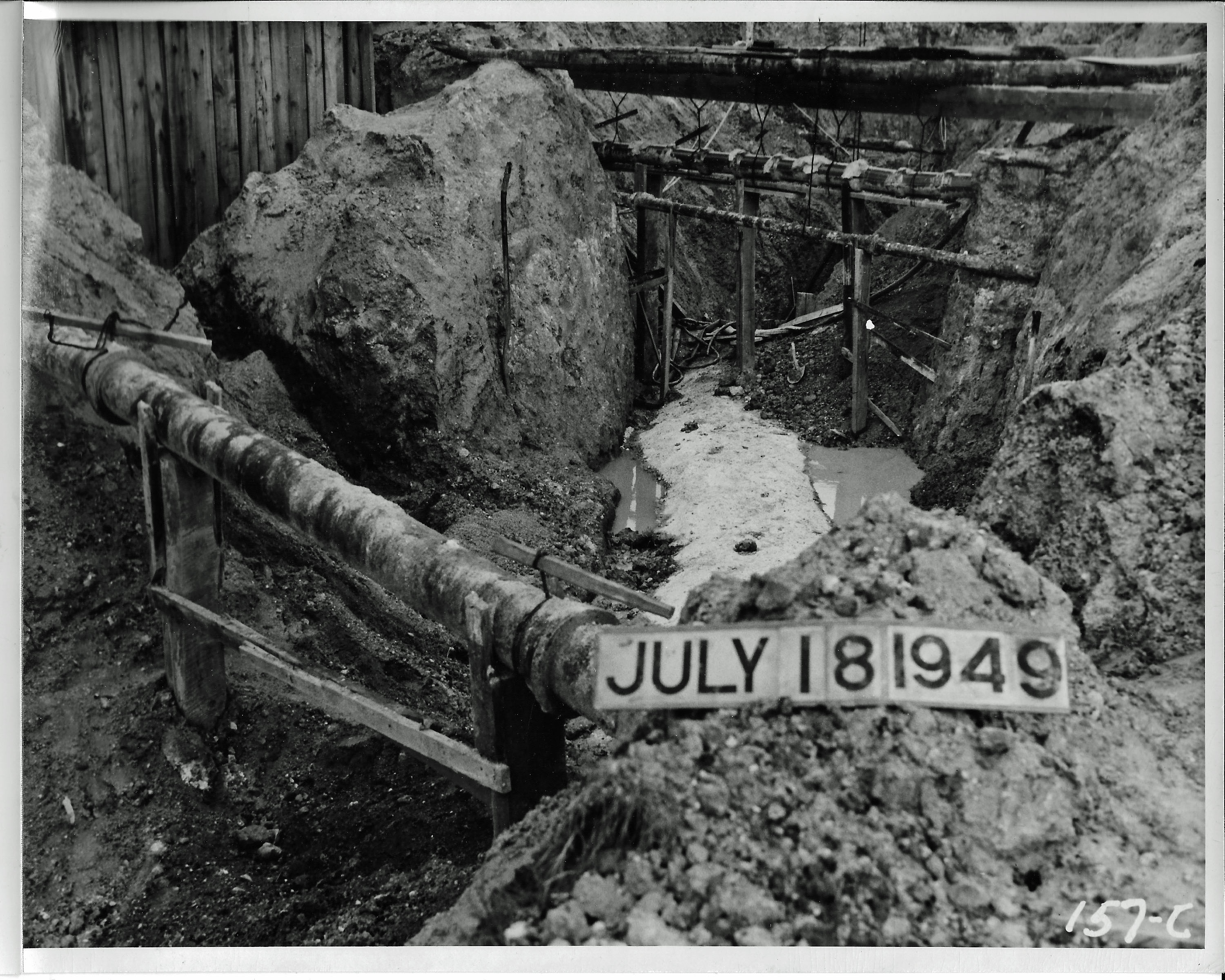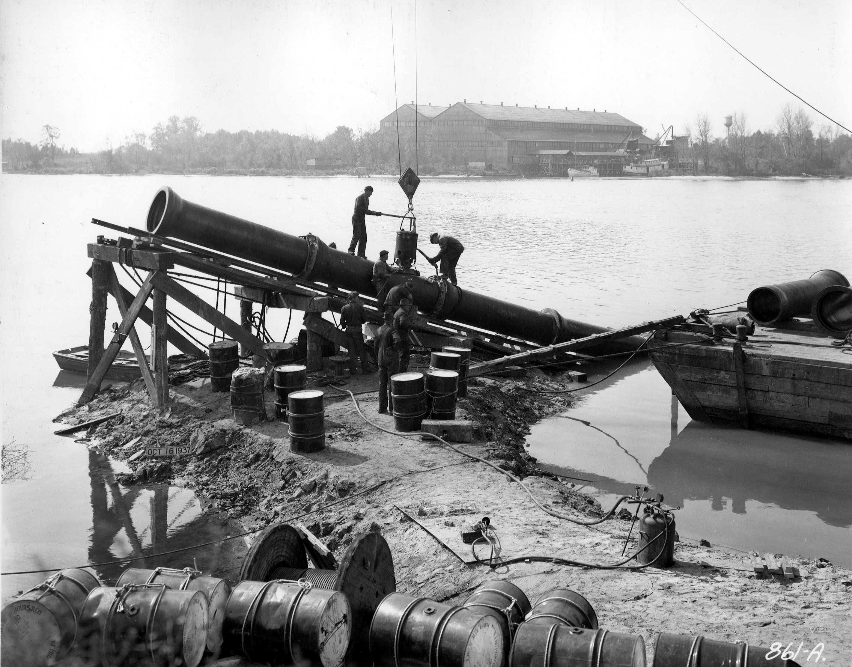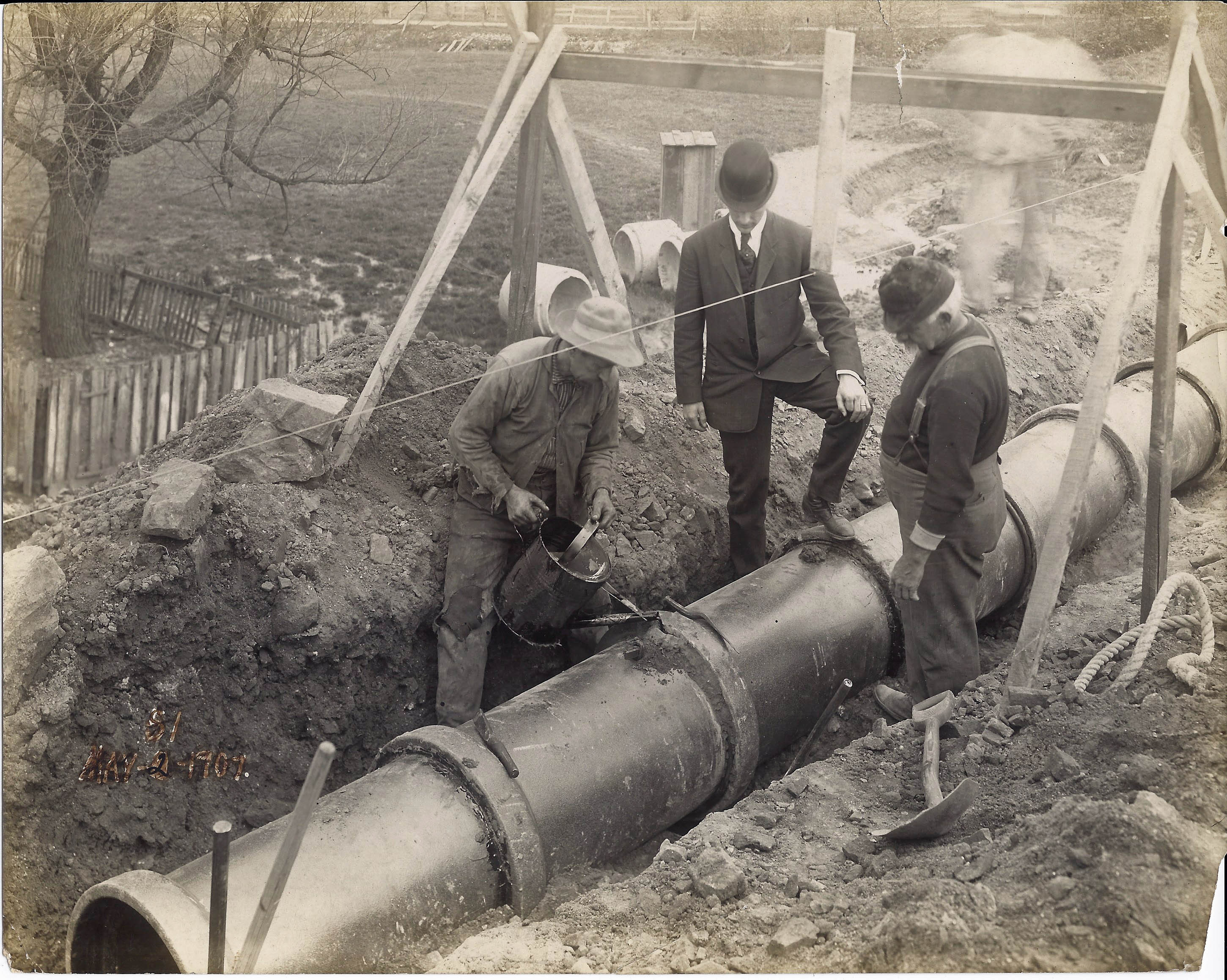 Another photo of a lead jointed pipe. I believe this is the water main under Curtis Creek. Looking close you can see the workmen pouring the lead into the joint.