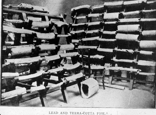 Below is a photograph from an old water works magazine showing lead and terra cotta pipe.