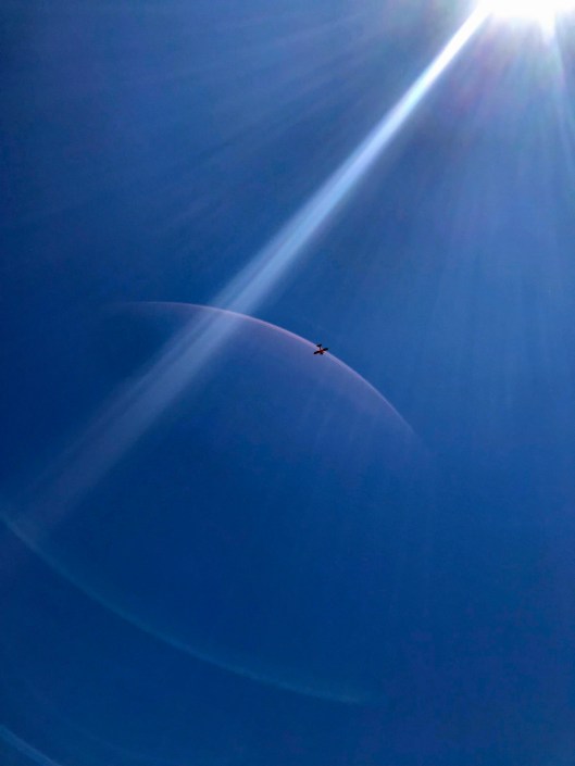Kathy’s pic of me trying to take a photo of a bi-plane flying overhead. Red Baron.