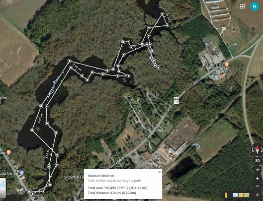 Our trip. Just over 7 miles with all the zig-zagging and crossing over the Pocomoke.
