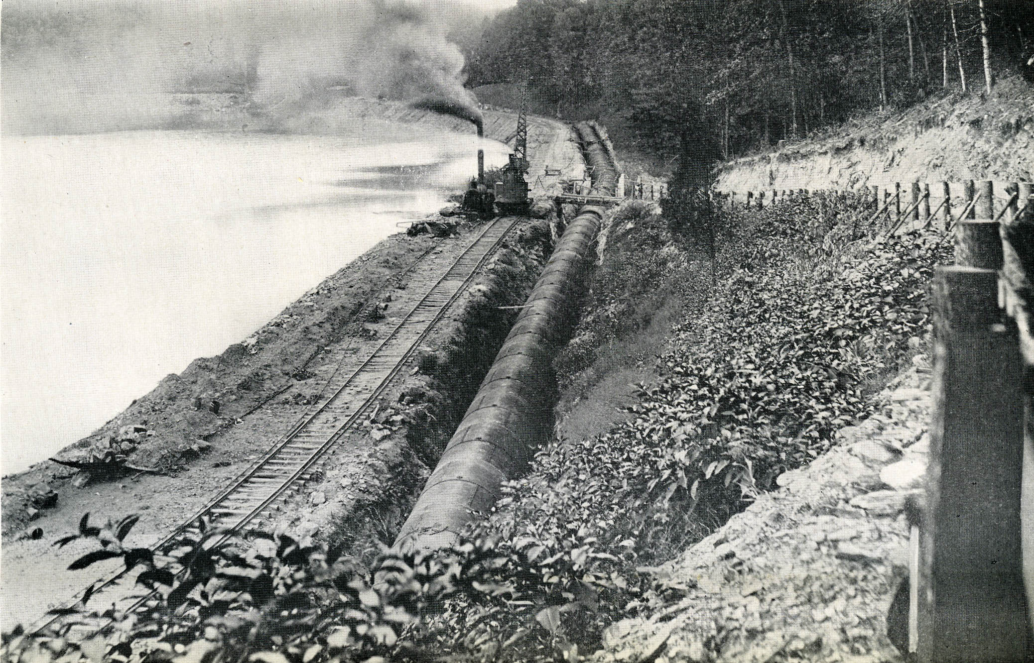 A couple more intact plates, not found in previous collections of building the 1915 dam. I like this one, below, looking downstream of the Gunpowder River. A locomotive riding the spur track in the distance and a person on the trestle.