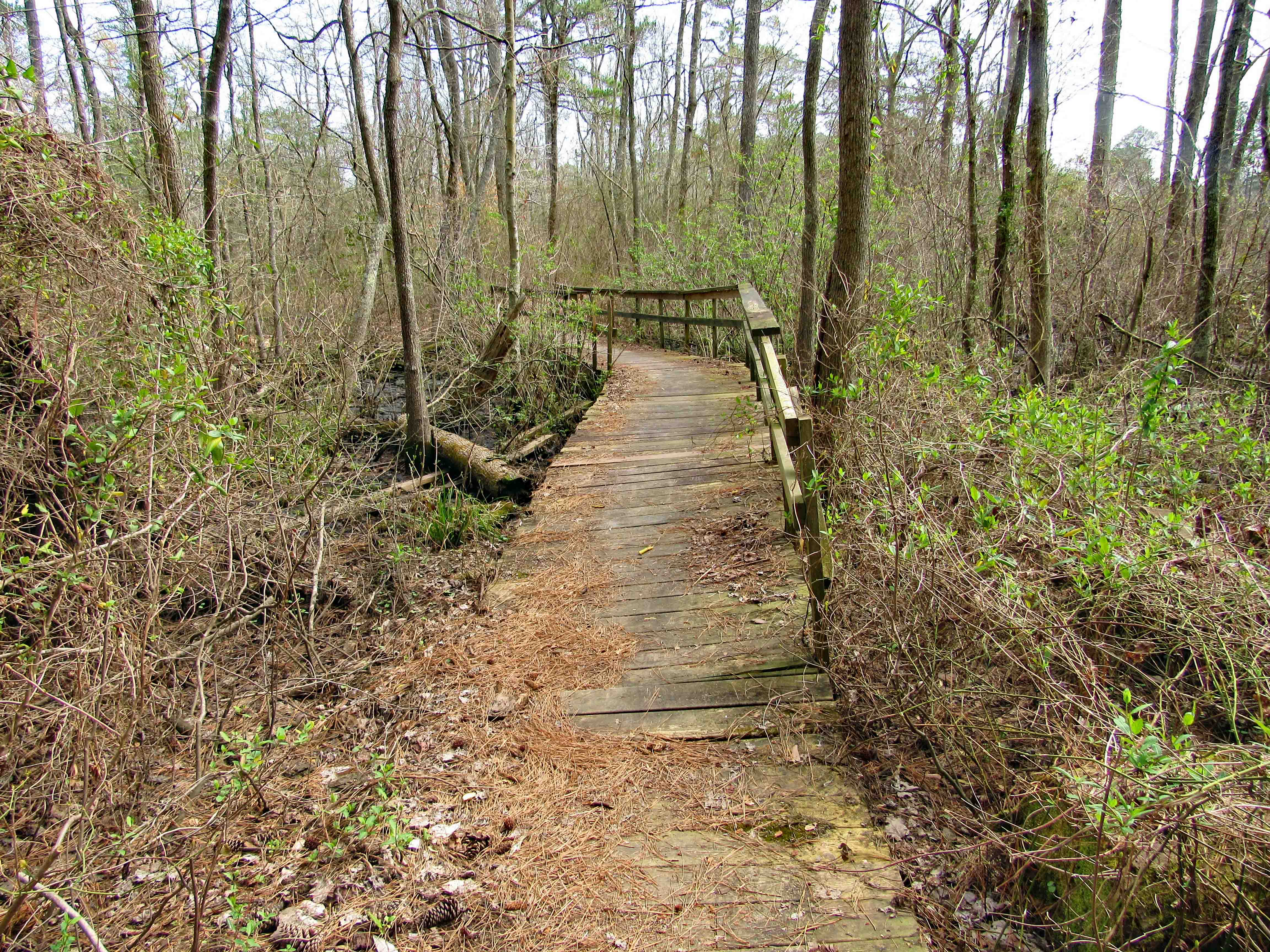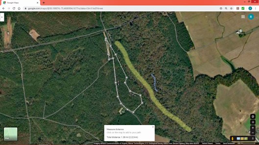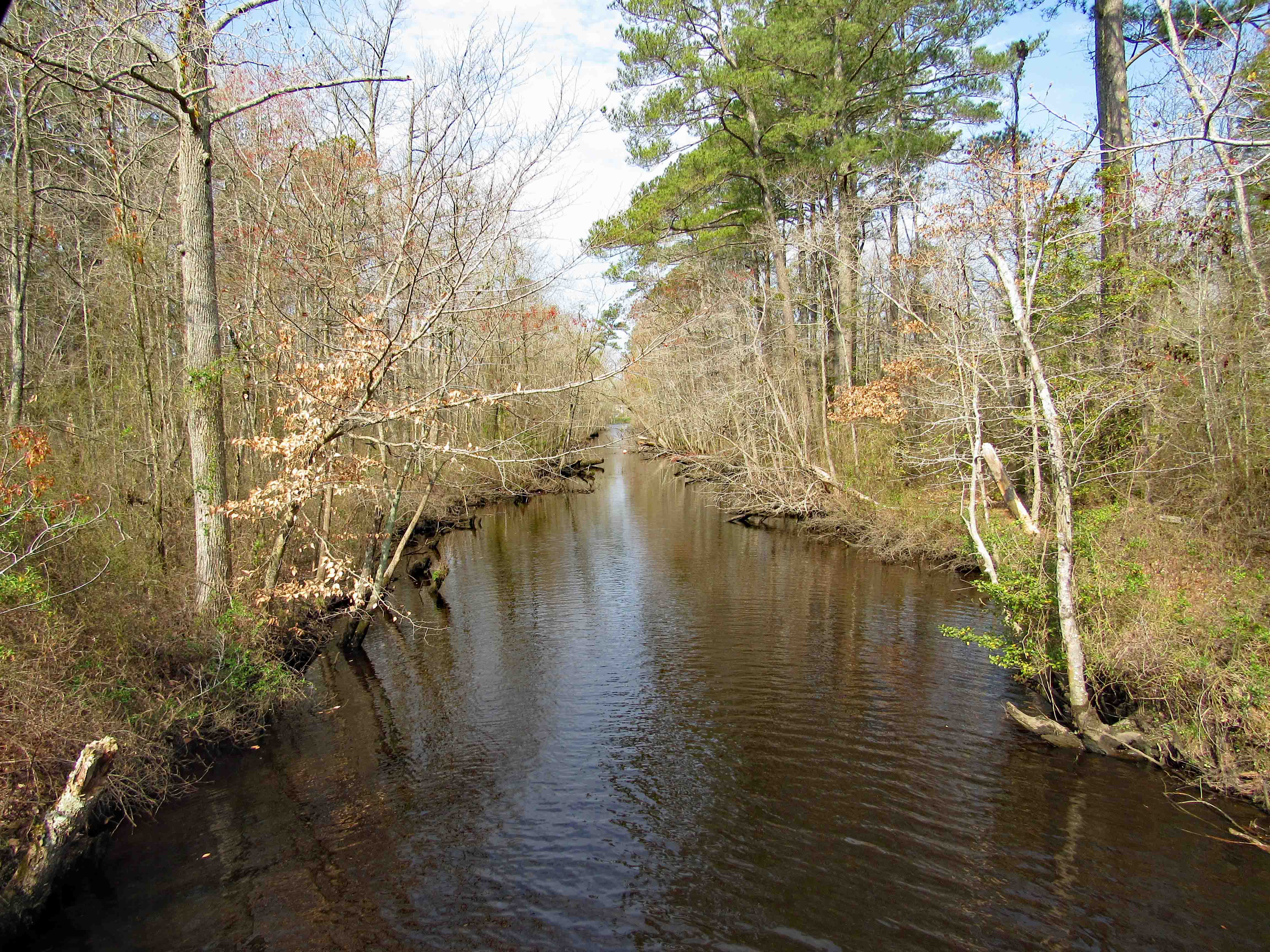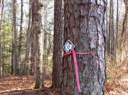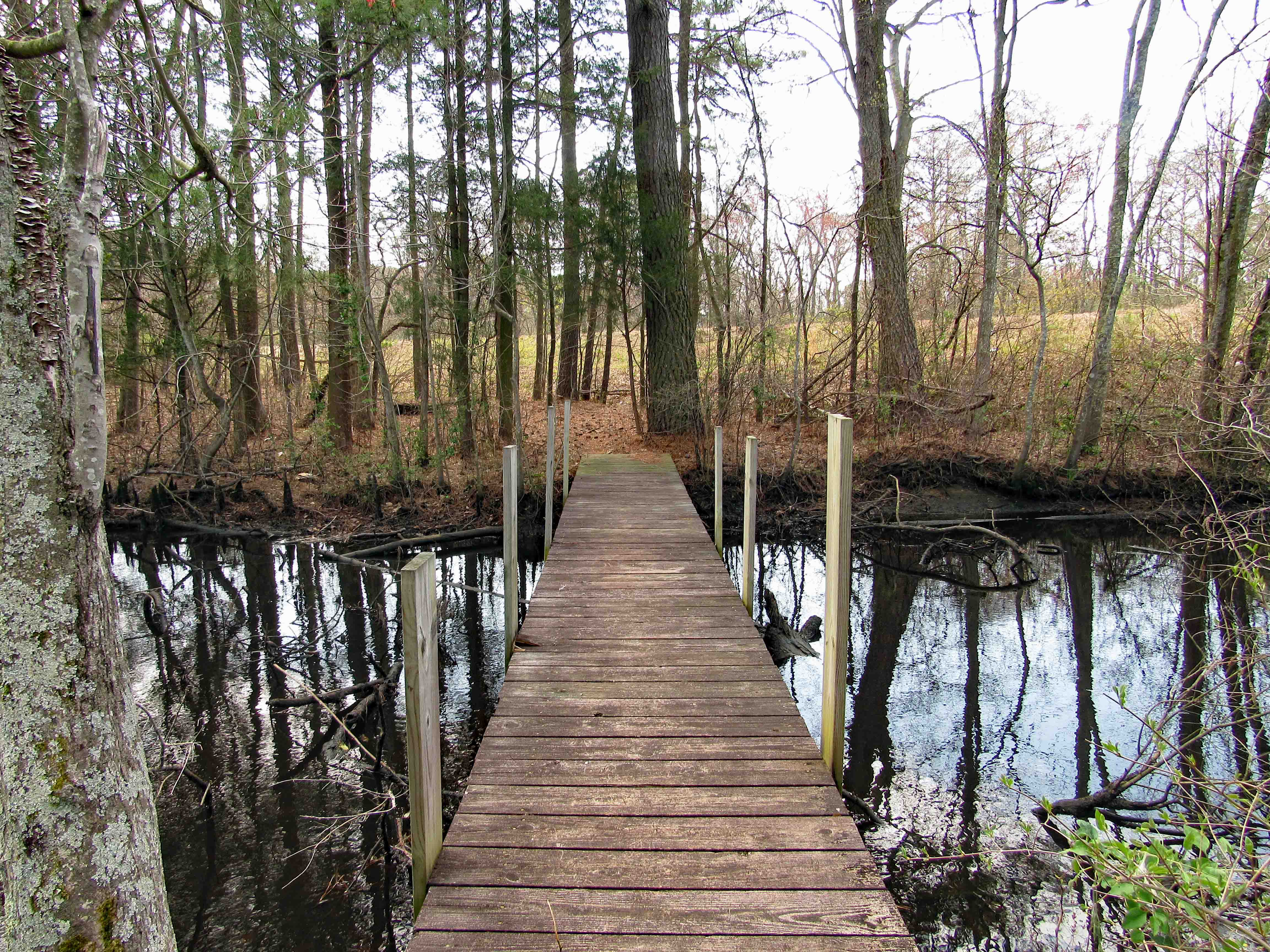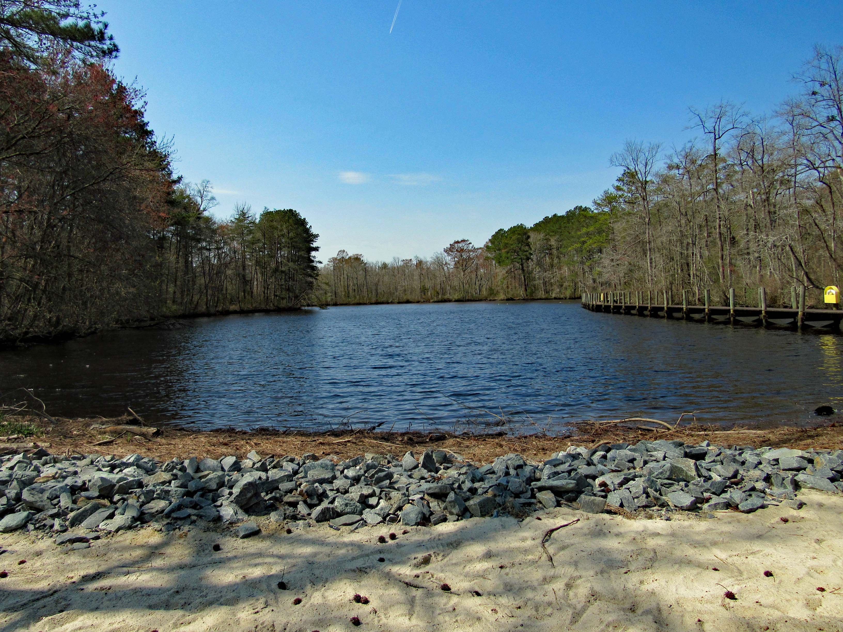 This was a 3.6 mile or a 4.1 mile hike, depending on which map you use, in the Pocomoke State Forest. There is also a Green Trail (4.4 mi) and a Blue Trail (5.2 mi) in the same area. We chose the White Trail because it heads towards a creek – Corkers Creek. The entrance is across Rte. 113, from Shad Landing. Nice empty parking lot.