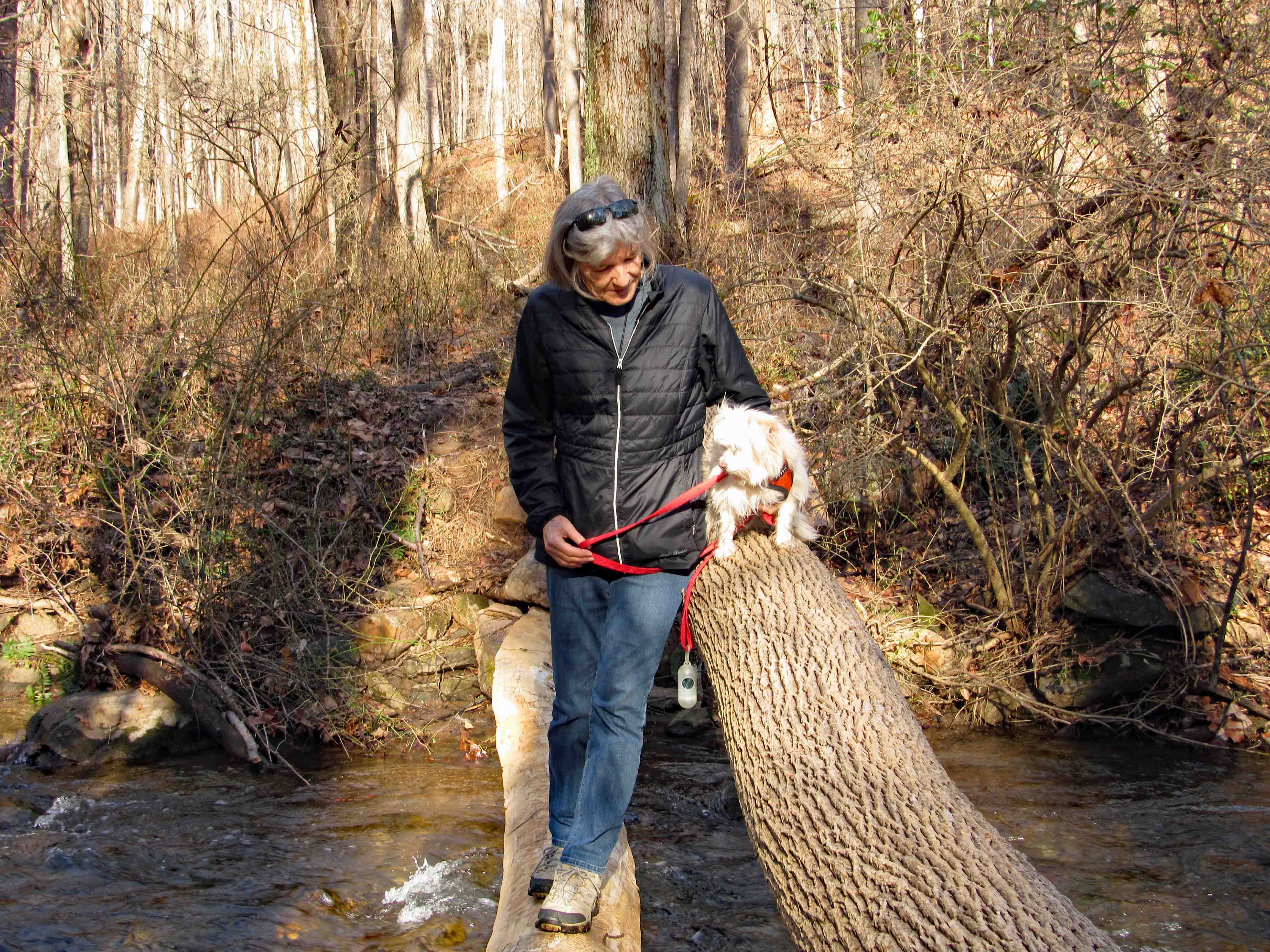 The Blue Trail goes all the way up the hillside then cuts over to the power lines. We like hiking along the river, so we found a log and crossed over one of the many streams. Molly not too happy about that.
