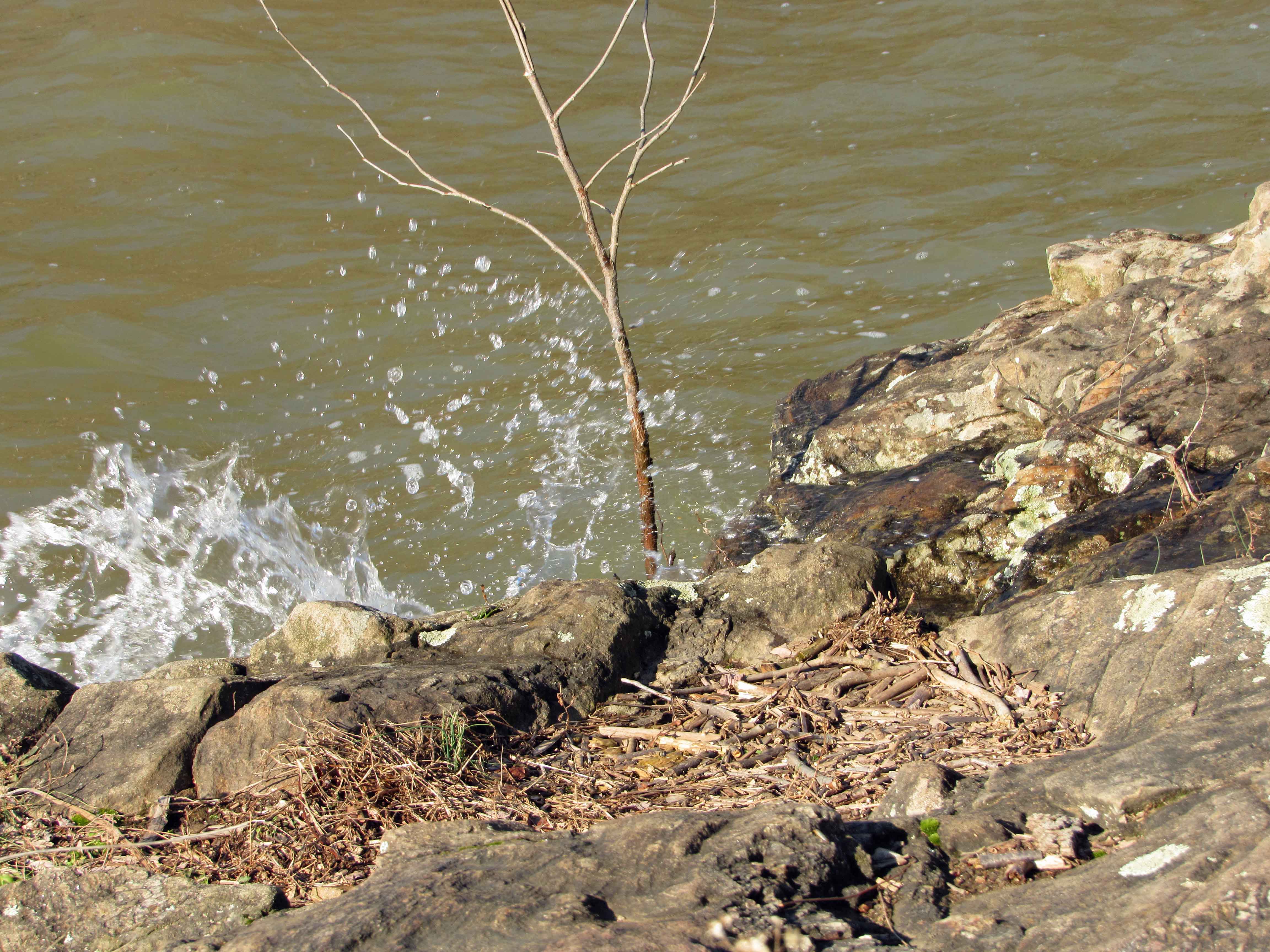Climbed down to the bottom of the dam, along the retaining wall. The water is lapping along the top of the wall.