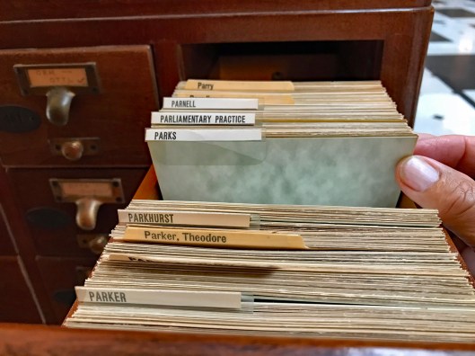 Of course, since you are not allowed to roam around the upper shelves, the next best thing to do is to look through the card catalogue. My name is there – but no listing of my books!