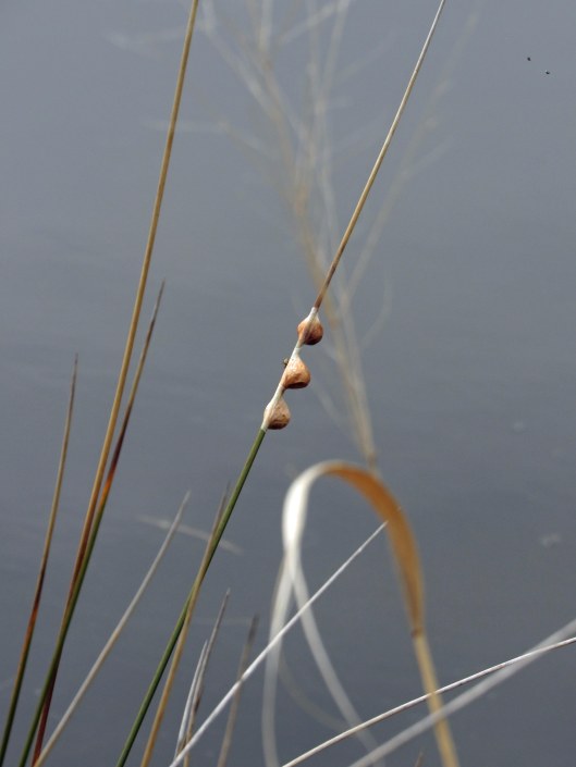 Not sure about these guys. There were hundreds of snails on the shore and low on the grasses. Looking close at the middle one, I see eyes or something…