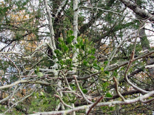 Fooling around with the mistletoe. Amazing how this stuff grows right out of the tree.