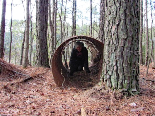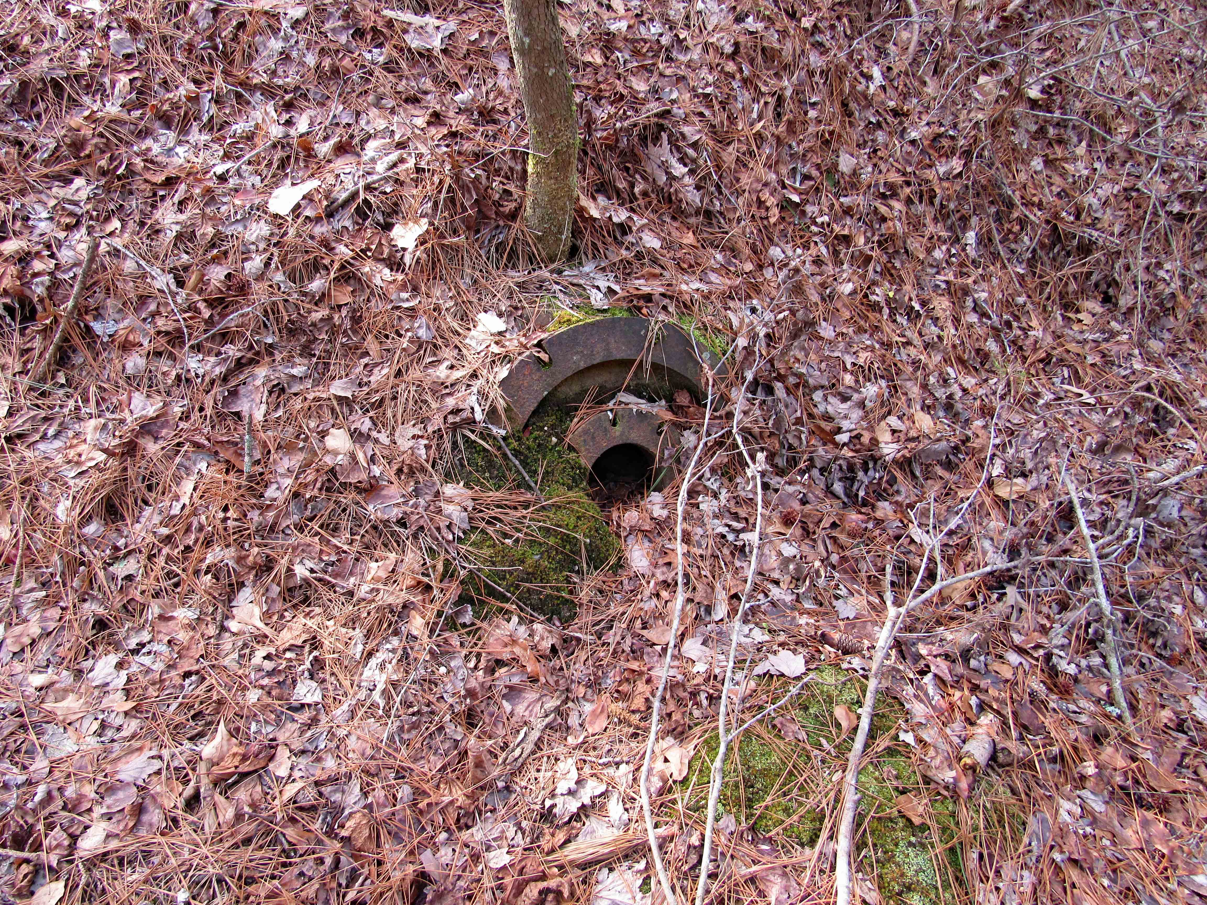 We walk the trail to the woods and then head through to the old balancing reservoir shaft.
