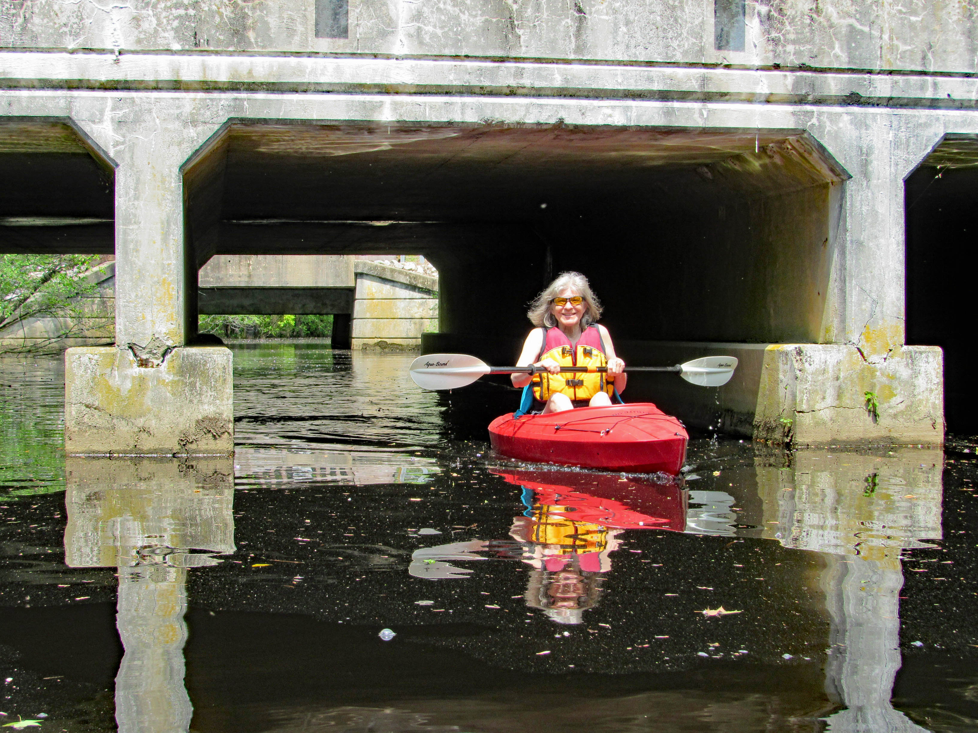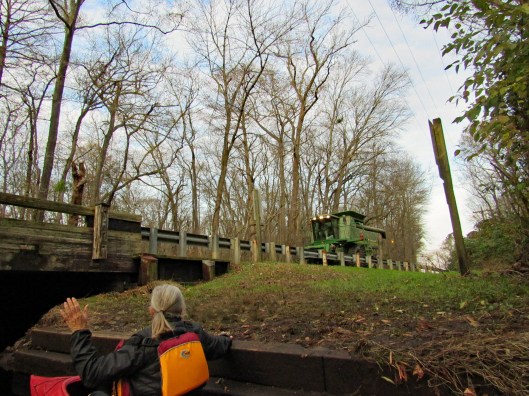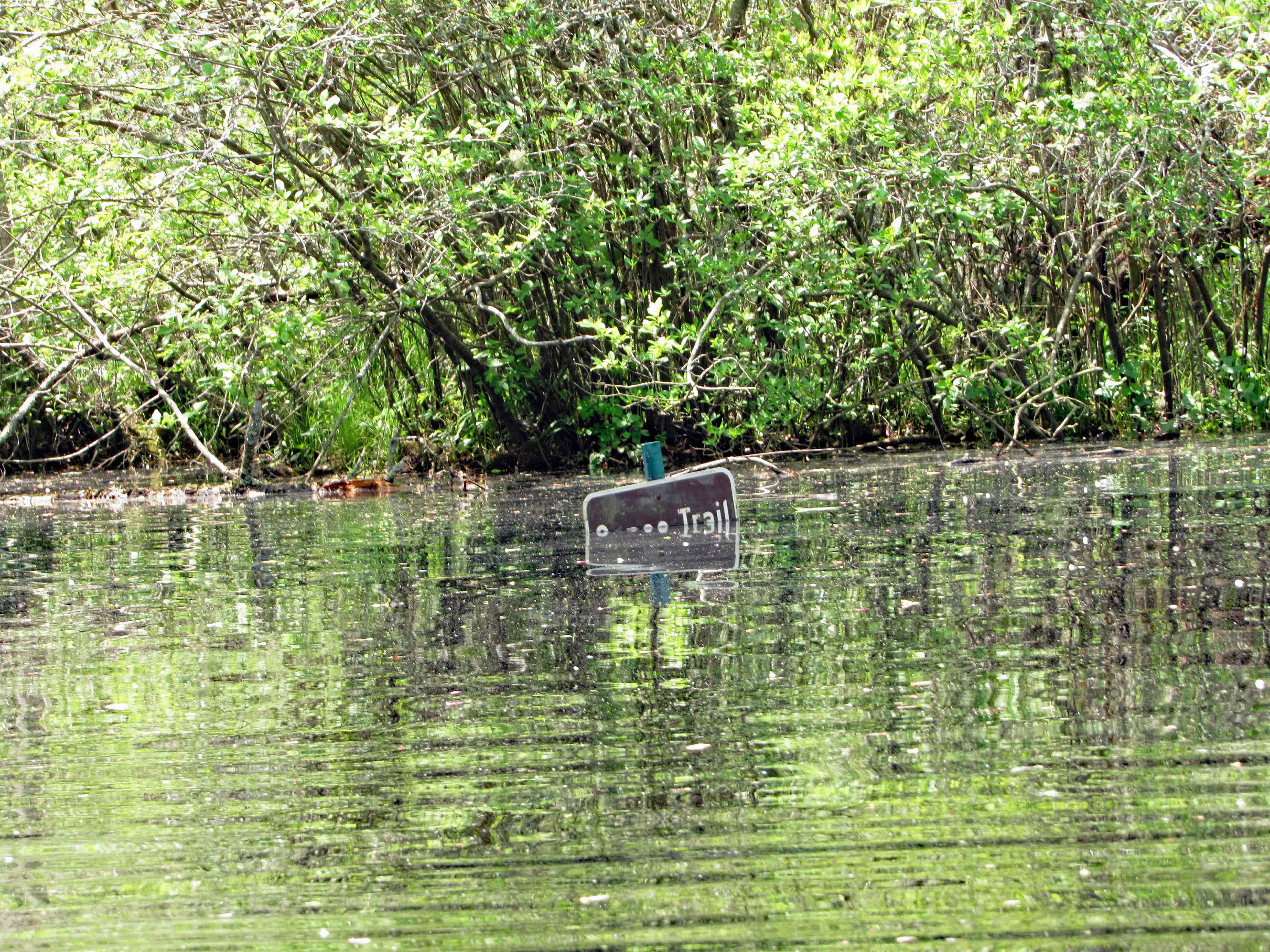 So we make our left hand turn and Kathy see’s this sign. It is halfway covered up. She goes in for a closer look and under ‘Canoe Trail’ is an arrow pointing right.