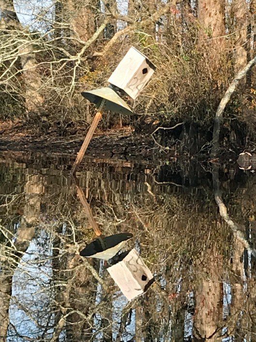 The water was high enough to take away the protection of the metal cones that protect the birds from predators. Also, the lily pads had come up, only to be submerged.