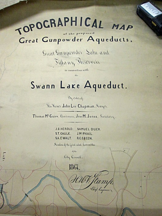 And finally, on the map title is HMF v Stamp as the Chief Engineer. I could not find anything about this person until 1873 where he is listed as the contractor to build the Temporary Water Supply, from the Gunpowder to Roland Run, which fed Lake Roland. It consisted of a couple pumps near Meredith Bridge, running some pipes to dump into Roland Run.