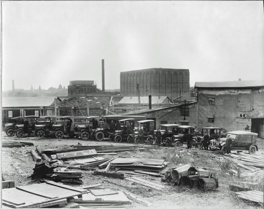 The commission’s garage and work area was destroyed by fire. Looking thru the building on the left you can see the burnt autos.